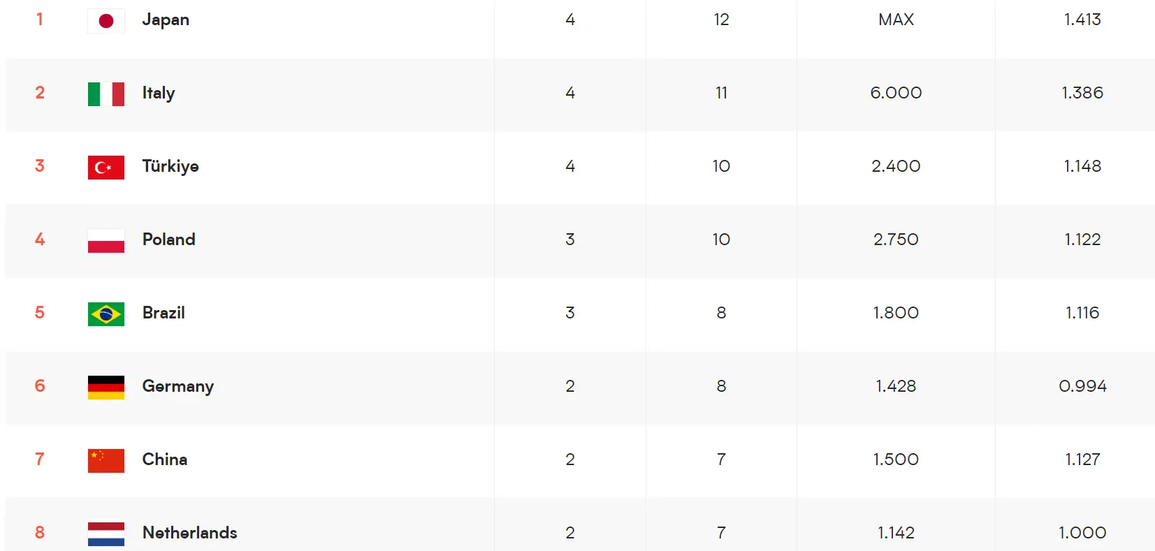 截至目前,日本女排不单拿下了亚洲第一的头衔,更是在世联赛榜单高居榜首,日本队4战全胜拿到了12分。对于这个结果,球迷们多多少少有些出乎意料,日本队首站的几位对手实力都不弱,却都输给了日本队,可见日本女排进入新周期后不可小觑。再来说说积分榜的其他排名情况,土耳其女排凭借着在中国身上拿到了3分,一举登上了榜单的第3名,二队土耳其居然也有10分进账,简直不要太强势。北京站的另外一位对手波兰女排,成绩也是相当不错,波兰队3胜拿到了10分,排在了榜单的第4名,紧随其后的是同赢3场的巴西女排,后者总共拿到了8分。巴西队在与意大利女排的对决中,惨遭对手横扫,故而世界积分被扣去了8分,积分差距逐渐被意大利拉开。